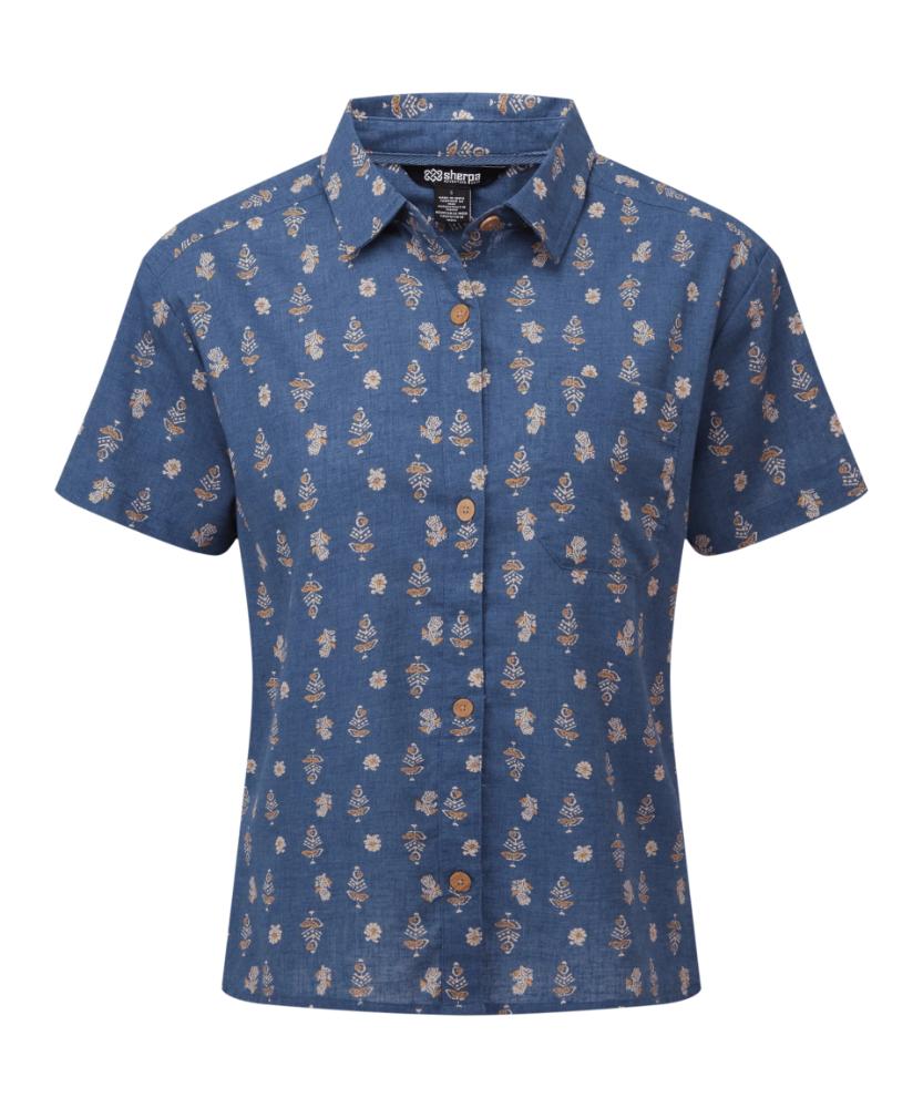 A relaxed fit short sleeved shirt for daily wear in warmer weather, the Jaya Camp Shirt is both practical and stylish. Made from a blend of recycled cotton and recycled polyester, the fabric delivers softness and breathability, helping to regulate temperature and manage moisture for day-long comfort. A pleated back yoke provides soft, structured draping and ease of movement. A single chest pocket and faux wood buttons deliver a timeless, relaxed feel. Featuring Sherpa's signature endless knot motif on the buttons, the symbol represents unity, conveying the notion that we are all tied together as one. Ideal for pairing with shorts or pants, the Jaya Camp Shirt will take you seamlessly from town to trail, and everything in between.