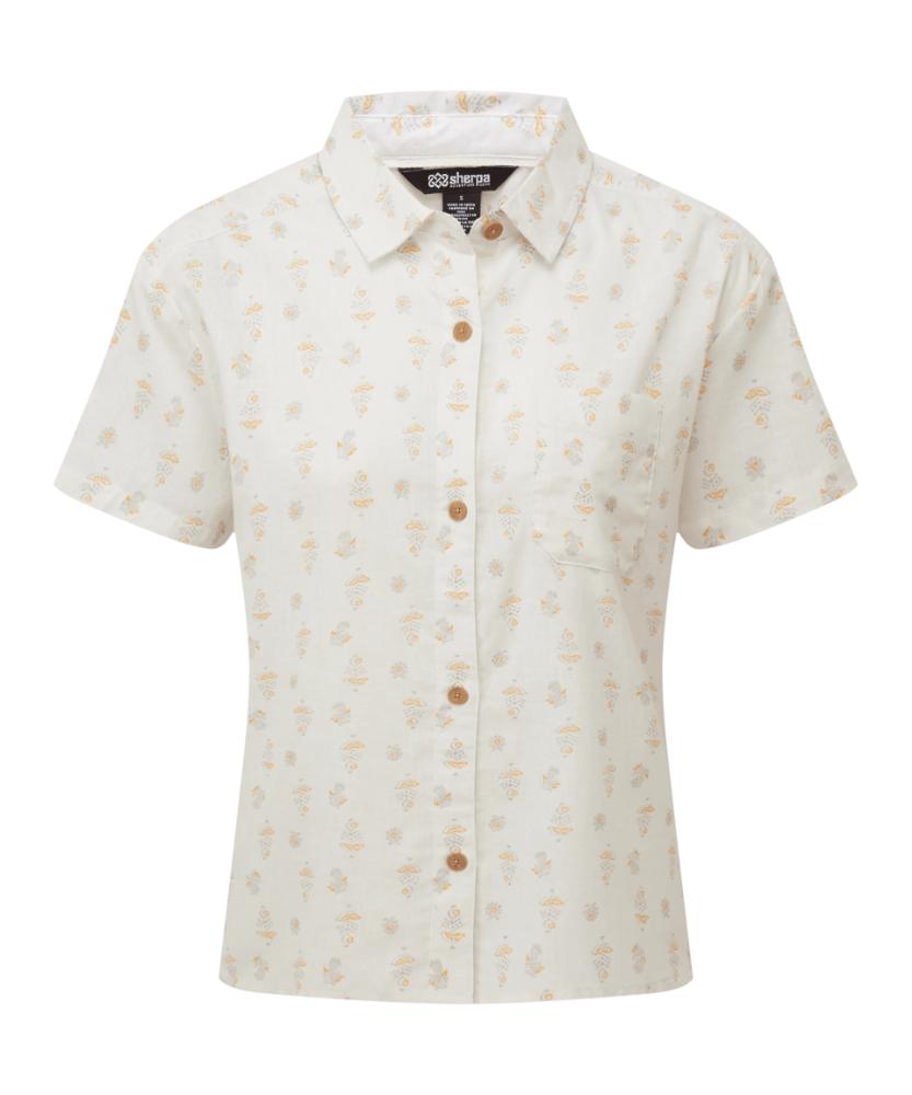 A relaxed fit short sleeved shirt for daily wear in warmer weather, the Jaya Camp Shirt is both practical and stylish. Made from a blend of recycled cotton and recycled polyester, the fabric delivers softness and breathability, helping to regulate temperature and manage moisture for day-long comfort. A pleated back yoke provides soft, structured draping and ease of movement. A single chest pocket and faux wood buttons deliver a timeless, relaxed feel. Featuring Sherpa's signature endless knot motif on the buttons, the symbol represents unity, conveying the notion that we are all tied together as one. Ideal for pairing with shorts or pants, the Jaya Camp Shirt will take you seamlessly from town to trail, and everything in between.