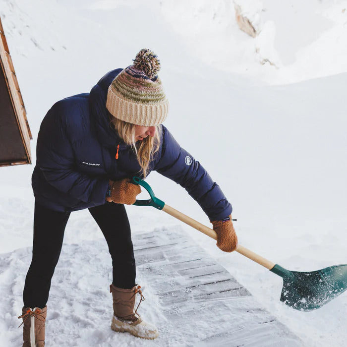 Crafted from a colorful recycled yarn blend, features a playful multicolored pom and soft, tonal colors. The wide ribbed cuff adds extra warmth and a snug fit