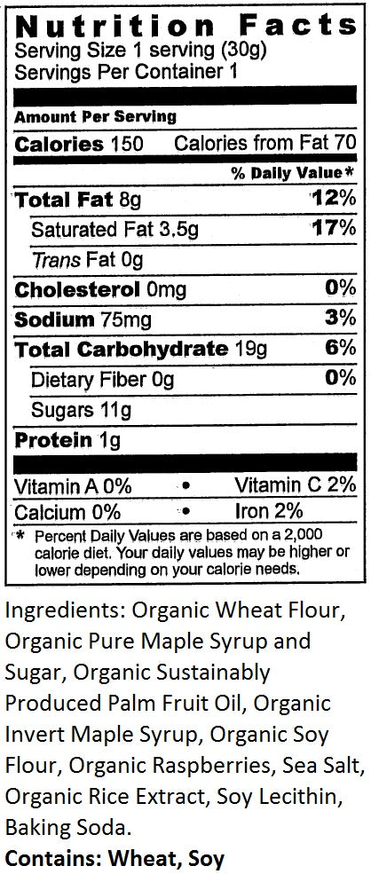 A great superfood combo: pure maple syrup and real raspberries. Each waffle has five raspberries packed inside and is sweetened exclusively with pure maple syrup and sugar.
