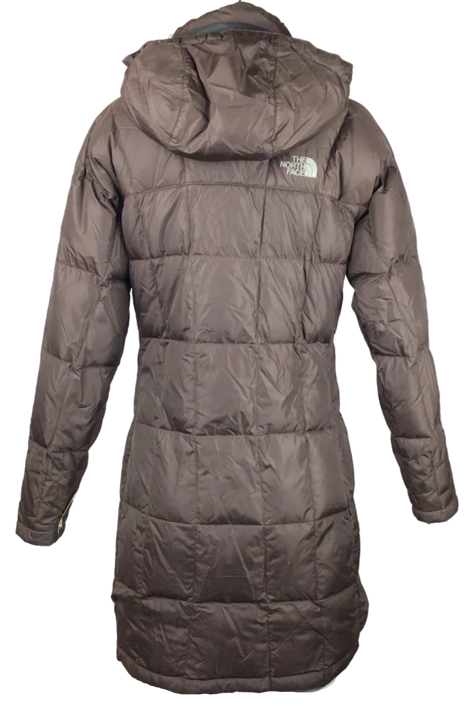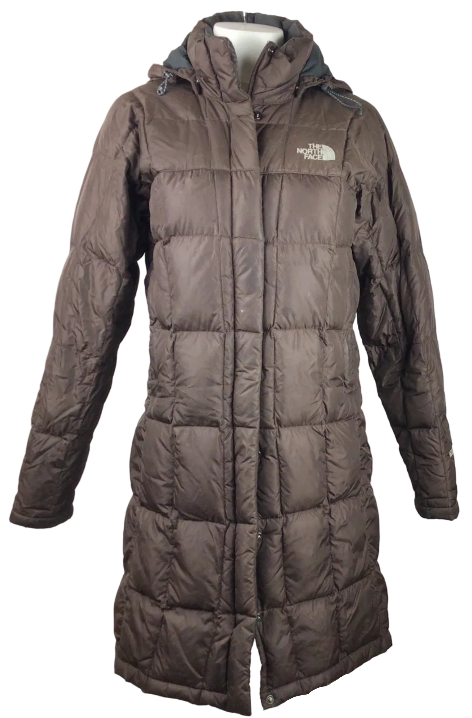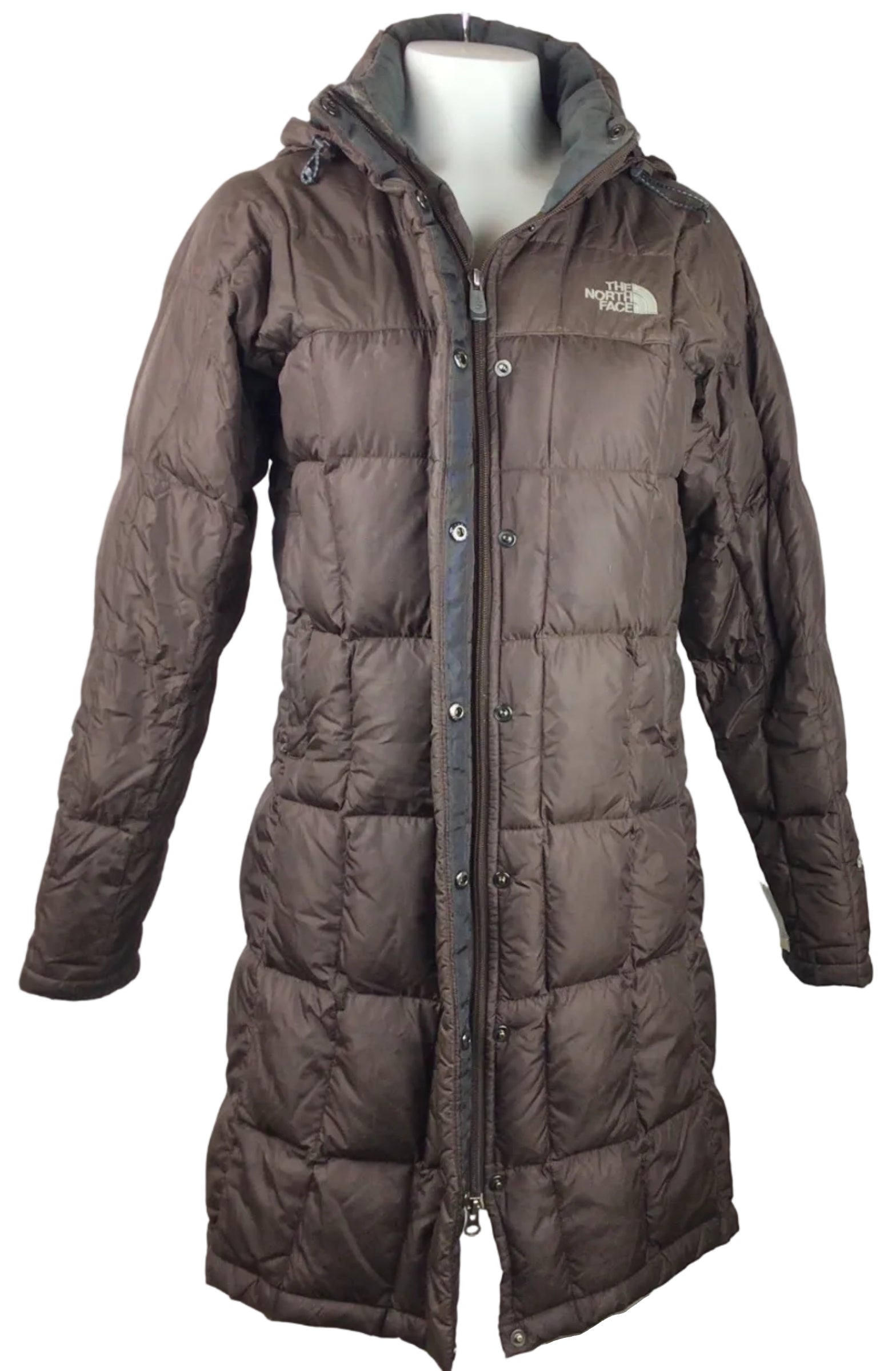 This classic North Face long puffer coat brings serious warmth and style to your cold-weather rotation. Featuring a cozy down-filled design with both zipper and snap closures for versatile layering options, it's built to handle whatever winter throws your way. The rich brown hue pairs effortlessly with your existing gear. Please note: this pre-loved piece shows its adventures with one discoloration mark on the front—a small character detail that speaks to its real-world reliability. Perfect for the adventurer who values function over flawless aesthetics.
