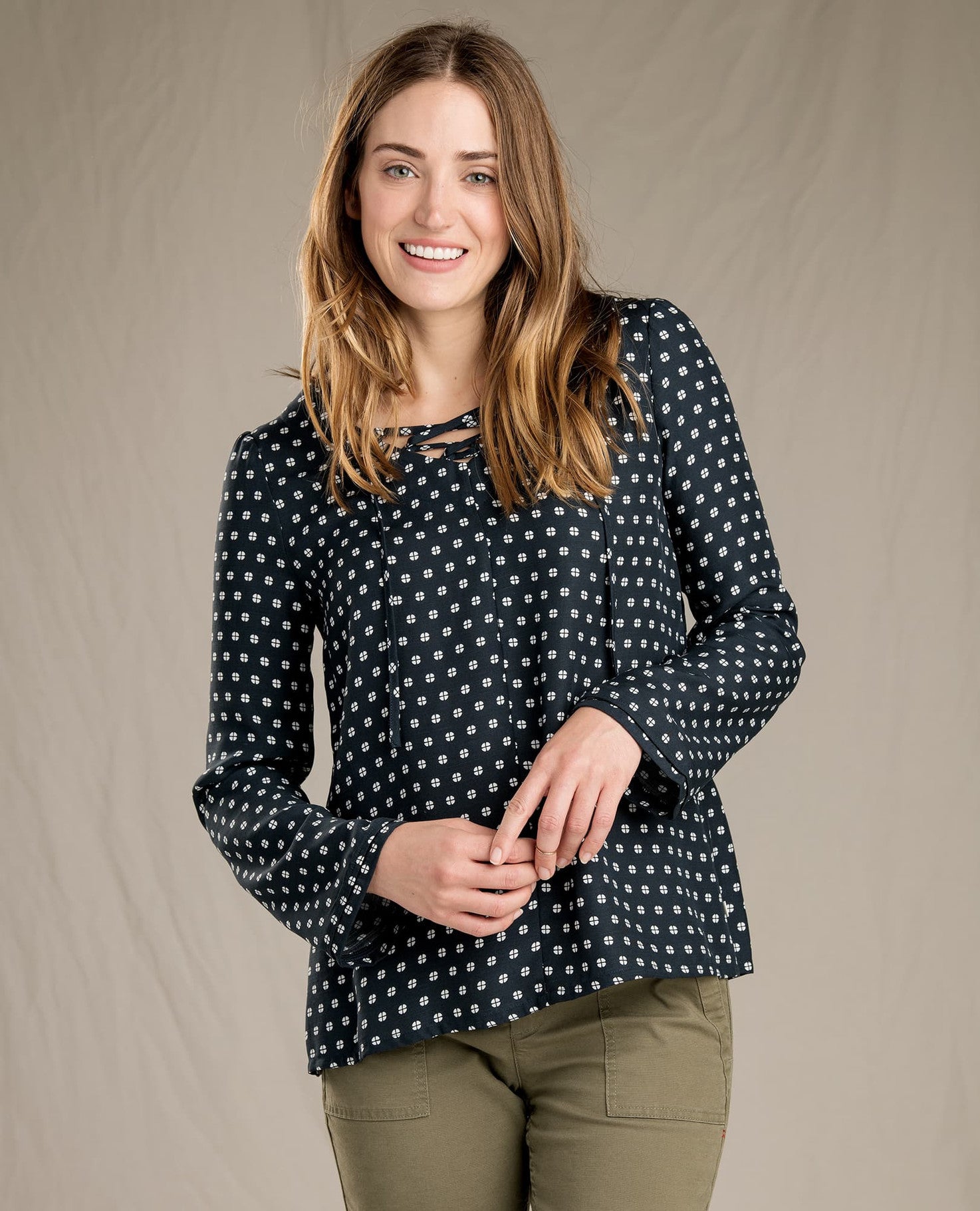 Picnic this fall under the changing leaves in Toad&Co's Hillrose LS Shirt. A delicate print and fringed bell sleeves make this sweeter than apple pie. Sustainable Tencel® is the a la mode on the side.