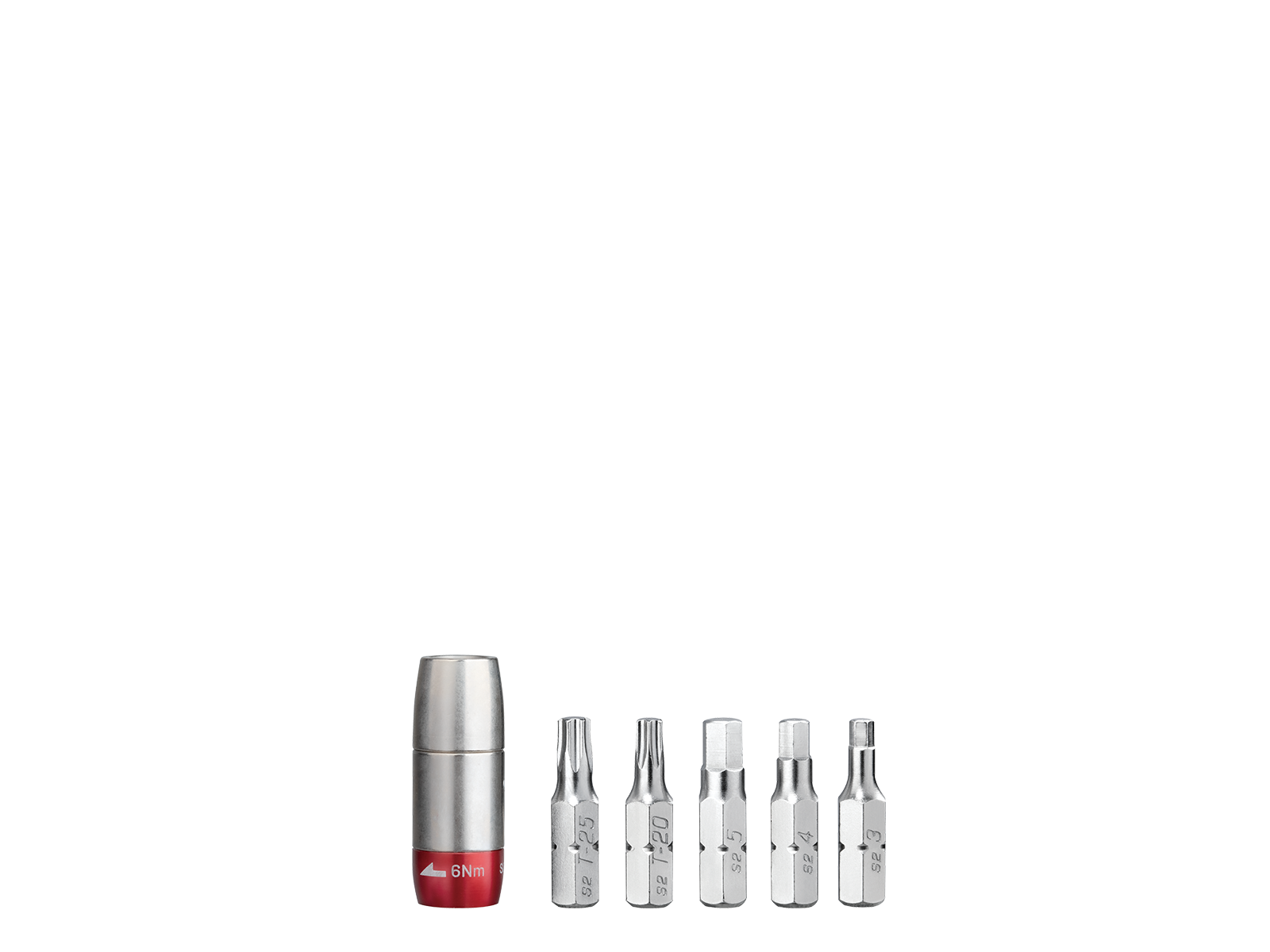 This preset 6Nm TorqSocket kit will work with any mini tool containing a 5 mm Allen wrench (or single 5 mm Allen wrench). Its advanced torque limit release design consistently applies precise torque values on component bolts for safety and prevents damage to expensive carbon parts. A carry case neatly stores one preset 6Nm and the 5 most popular tool bits (3 / 4 / 5 mm hex & T20 / T25 Torx®).