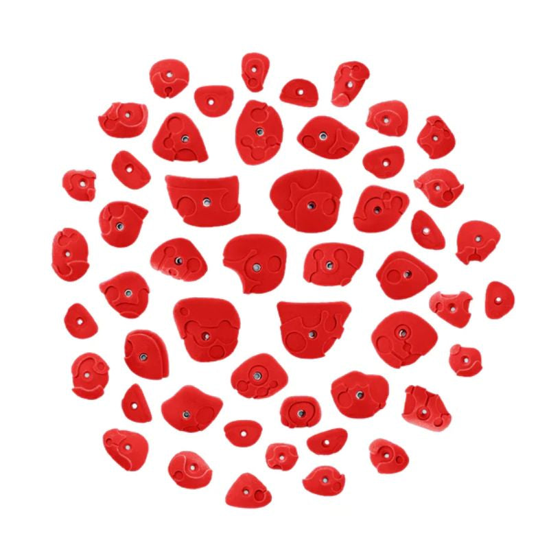 These holds look as good as they feel! The Drop Art pattern provides abstract thumb catches, while enhancing the aesthetics of your wall. This set includes Drop Art Mini-Jugs, Drop Art Incuts, Drop Art Finger Buckets, Drop Art Crimps, Drop Art Footholds, and a bolt to match every hold in the set. The Drop Art Starter Set includes 50 holds from the Drop Art Family and is packaged with matching bolts. No need to add additional hardware or to worry about buying the right size bolts!