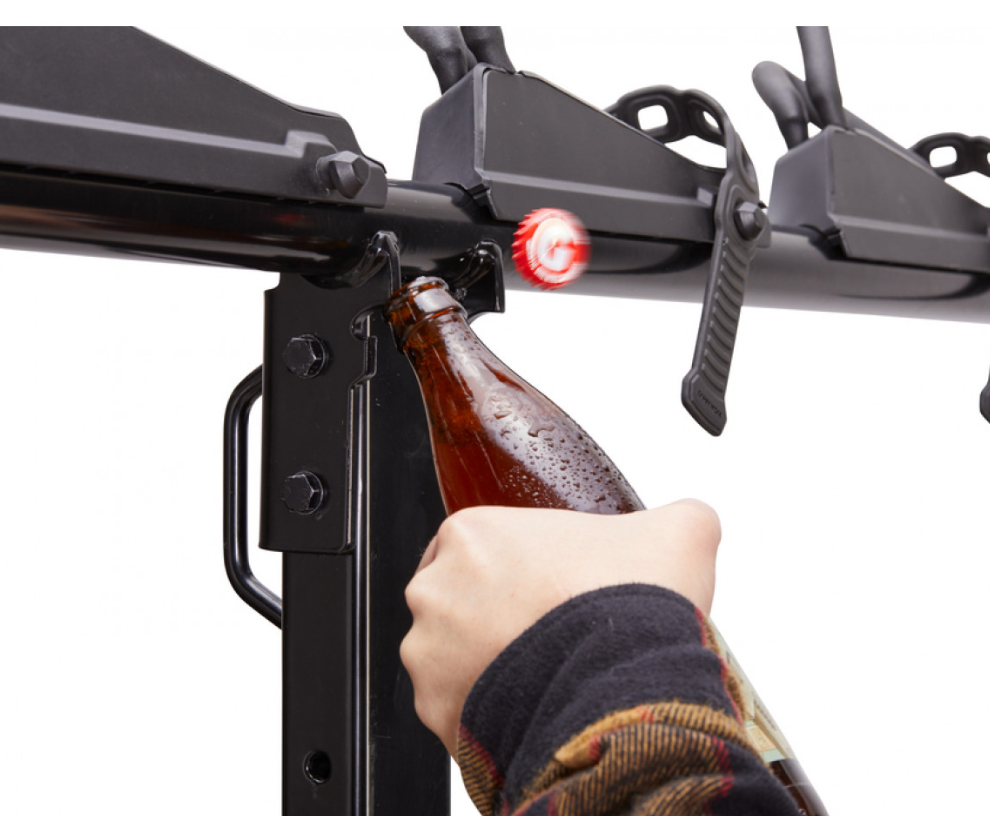 Perfect for tour operators, group rides and big families. Constructed of heavy-duty steel,Yakima's first-ever vertical bike rack safely hauls up to four mountain bikes to the trailhead. They designed and tested it in the lab and on the road to meet their demanding Yakima standards. The easy-to-operate tilt mechanism with two adjustable mast angles keep your bikes from bumping into your car, truck, or SUV and makes accessing the tailgate a breeze. The HangOver's vertical orientation carries more bikes in less space. Get ready to session!